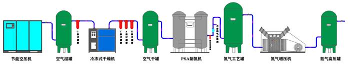 4.氨气净化:将分离出来的氮气通过净化器进行进一步净化,去除残留的水分、二氧化碳、烃类和其他杂质,