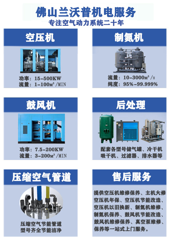 兰沃普机电左右提供品牌空压机、空压机维修保养、空压机大修、空压机节能改造、空压机以旧换新、空压机合同能源管理、品牌空压机后处理设备等一站式服务。为公司专注空气压缩机十五年,经验丰富价格合理,产品齐全售后完善。