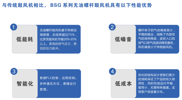 高效率压缩∶无油螺杆风机是基于热绝压缩原理,总效率超过75%,比罗茨鼓风机节能20-35%以上。优化的型线设计。使其具备更高的效率,先进的涂层技术,使得转子间隙更小,提高了容积效率的同时也有效的保护了鼓风机转子。螺杆鼓风机厂家独特的润滑和排油通道 ,保障轴承和齿轮得到良好的润滑和冷却,同时提升主机效率。